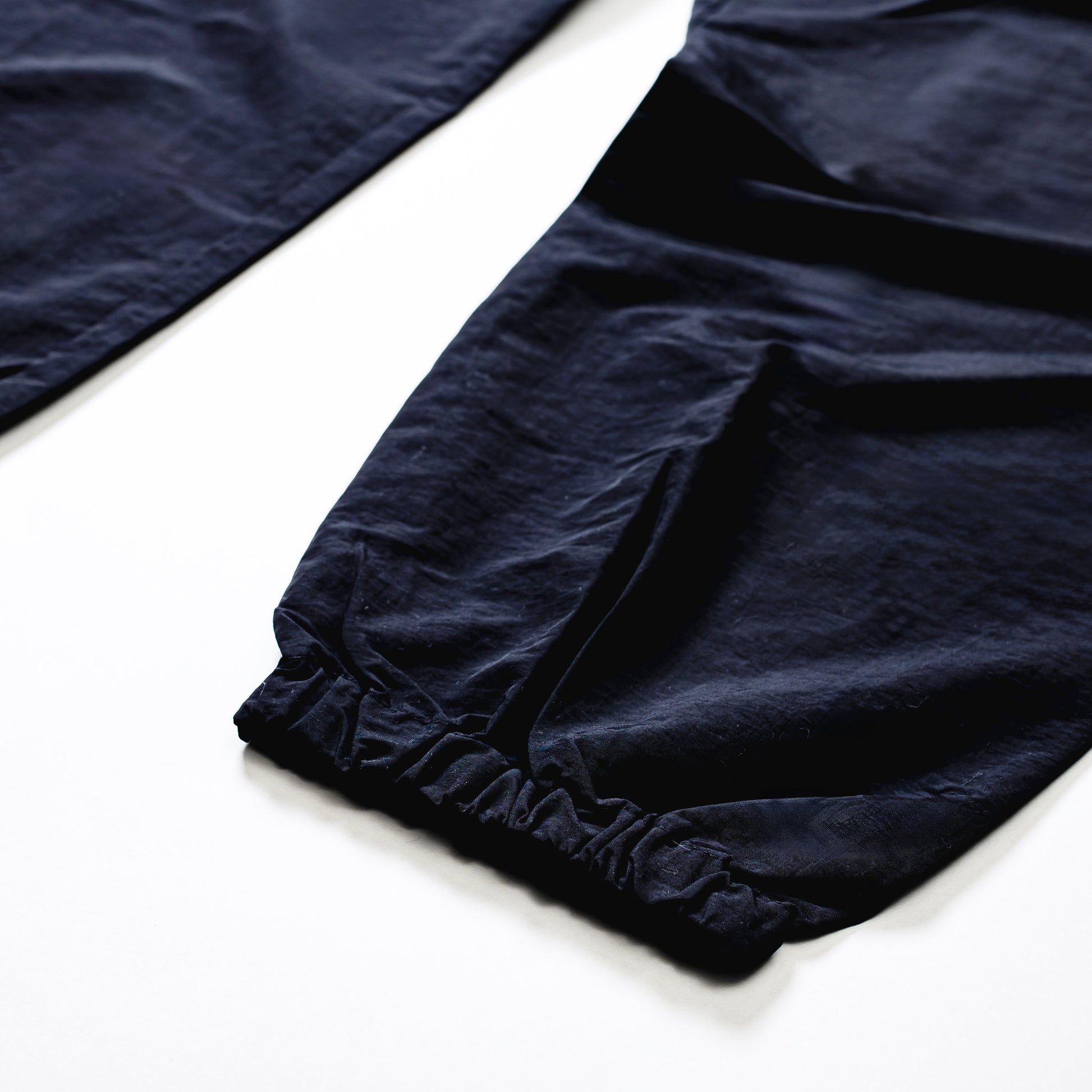 と共通のナイロン生地を使用し、セットアップとしての統一感を演出。こちらもゆったりとしたサイズ感で、リラックスした穿き心地を提供します。ウエストはドローコードで調整可能です。裾にもシャーリングゴムを施し、足元に程よいボリューム感と抜け感をプラスします。