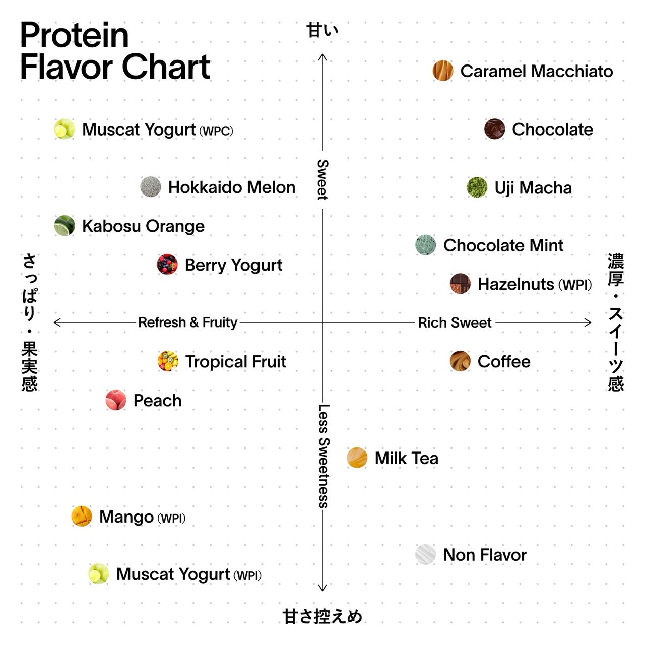(チョコレート/宇治抹茶/キャラメルマキアート/マスカットヨーグルト/コーヒー/ミルクティ/トロピカルフルーツ/ベリーヨーグルト/北海道メロン/マスカットヨーグルトWPI/マンゴーWPI/ノンフレーバー)